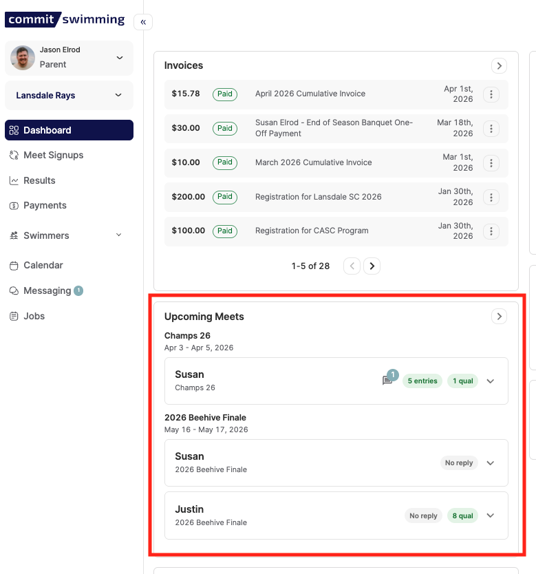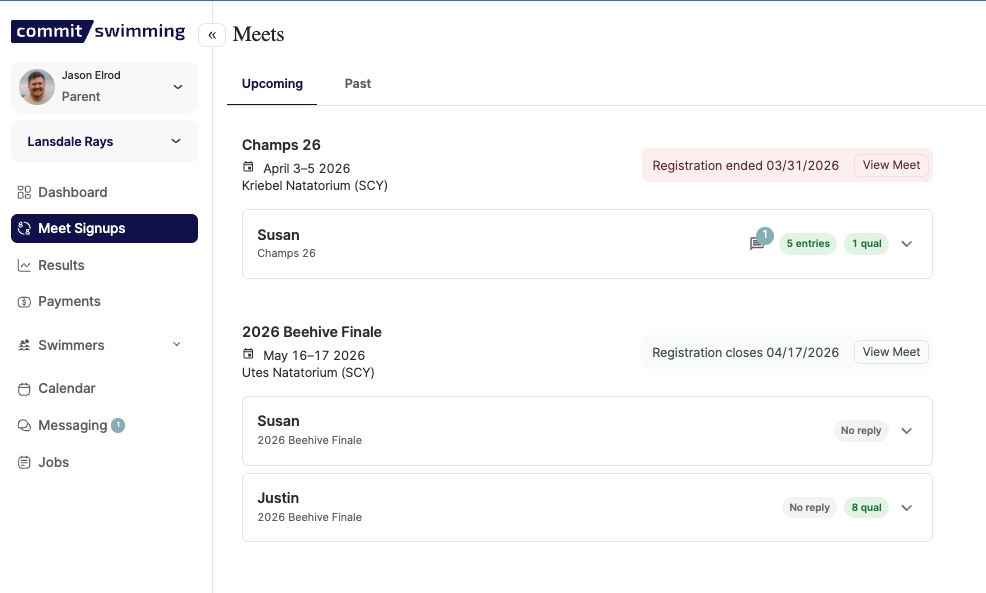 You'll see all upcoming meets right away on your dashboard, info about the registration, and your swimmer's status for the meet.