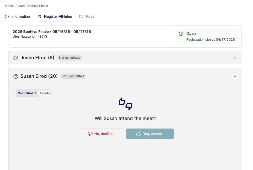 However, if the setting to commit by session is off - you will simply commit to the entire meet or decline the entire meet, no need to specify sessions.