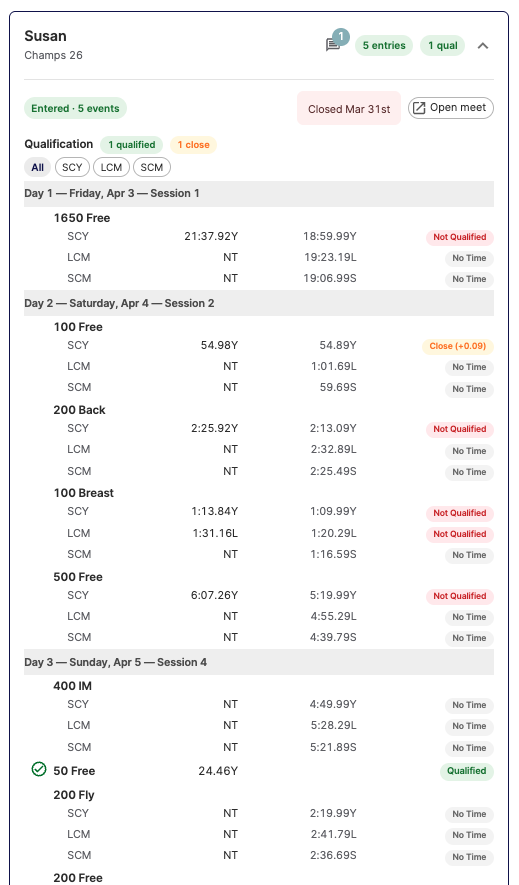 From your dashboard, you can also see a fuller picture of your swimmer's qualifications.