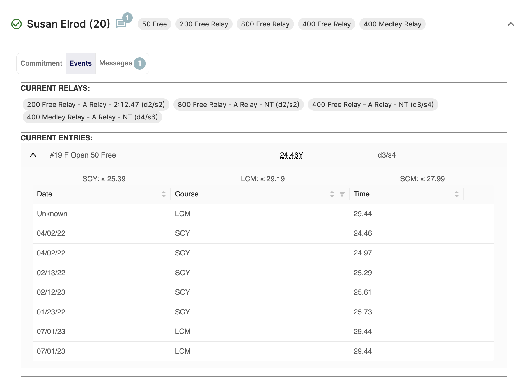 You can see the list of available events that the swimmer can be entered into on the Events tab.