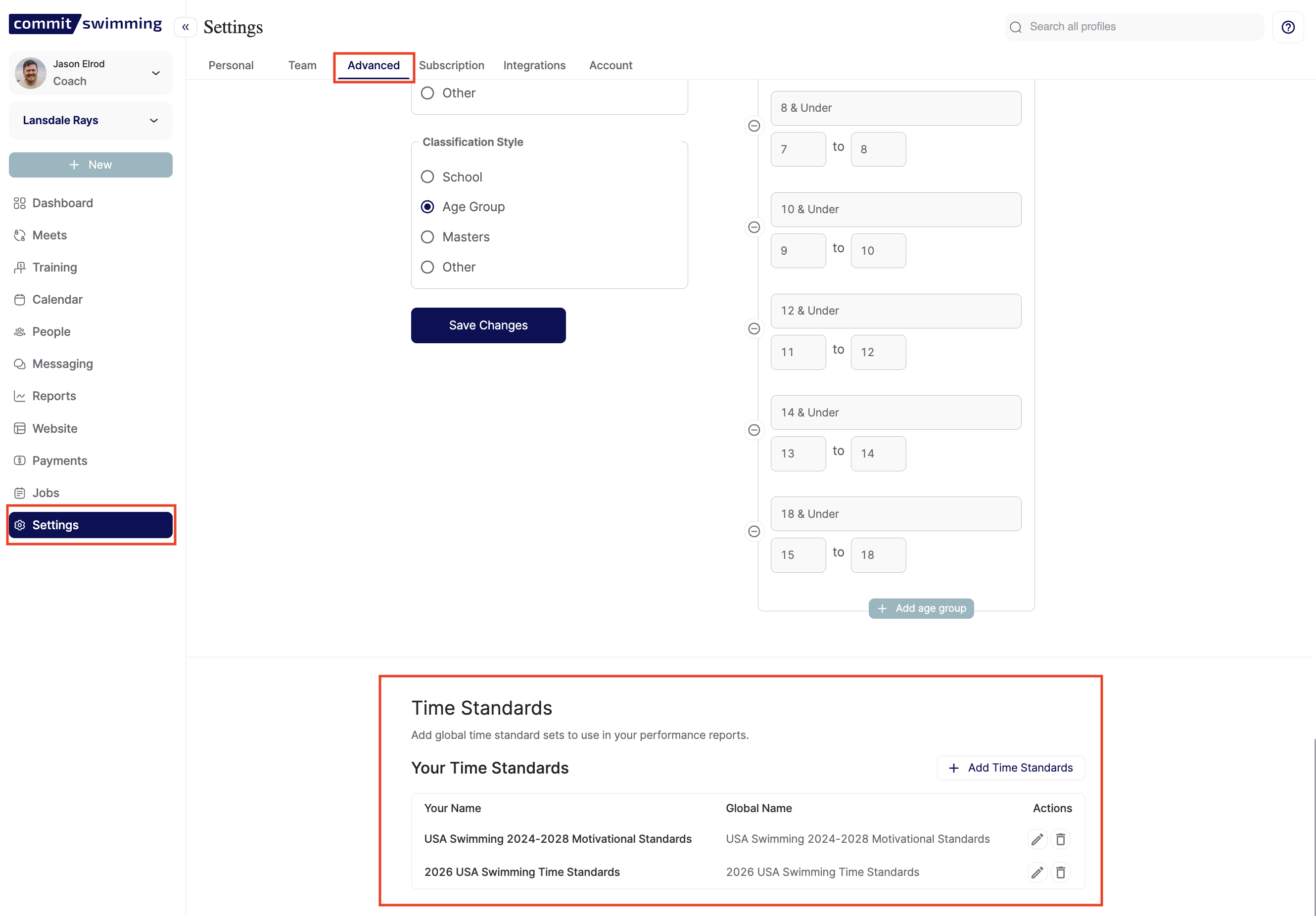 To add time standards to your club, navigate to your Settings menu and selected the Advanced Tab.