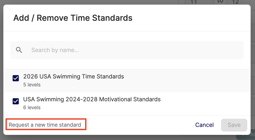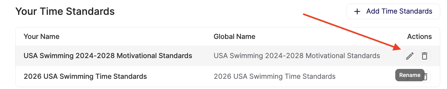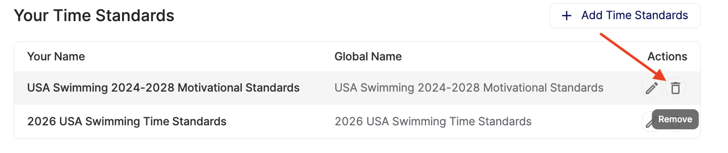 If you need to remove a time standard from your club, just click the remove icon next to it.