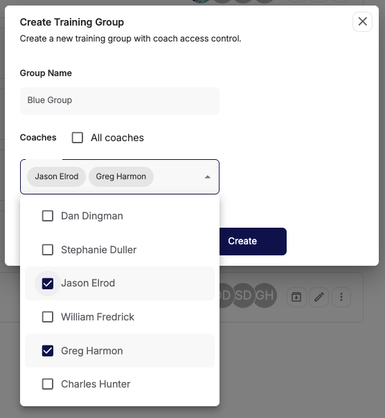 - Input your Training Group name and start selecting coaches who you wish to manage this training group. [This list of coaches comes from the STAFF LIST]