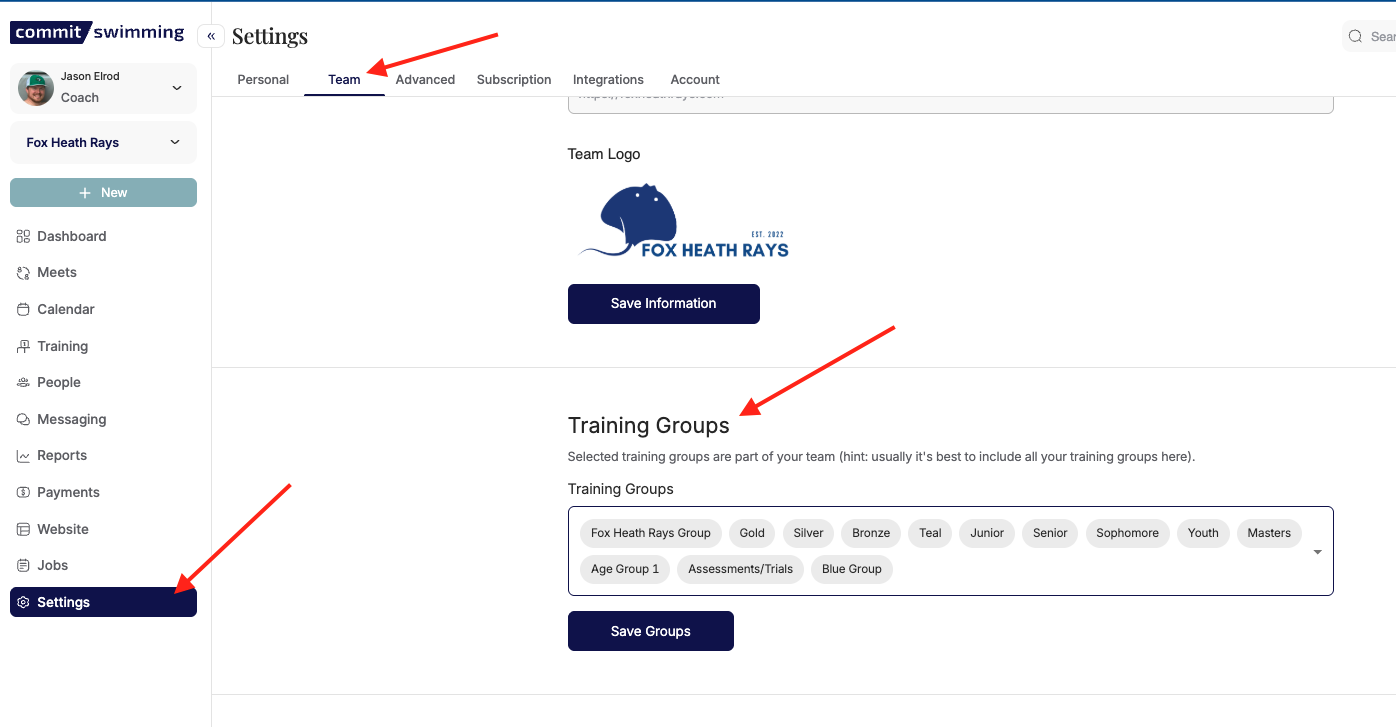 - If you are the admin for the team and have the ability to access settings, you'll need to navigate to SETTINGS and then go to the TEAM menu and find the TRAINING GROUPS section.