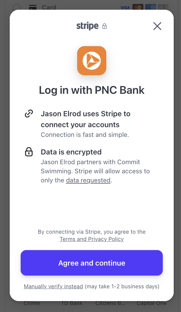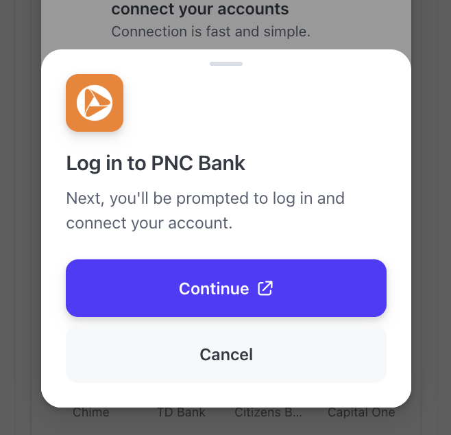 Continue - this will navigate you to your bank's portal in another window (ensure your pop-ups are not blocked)