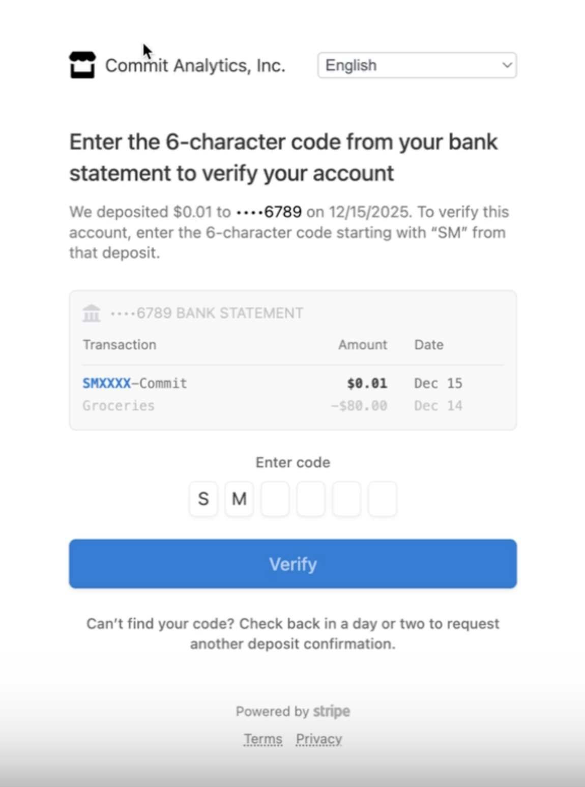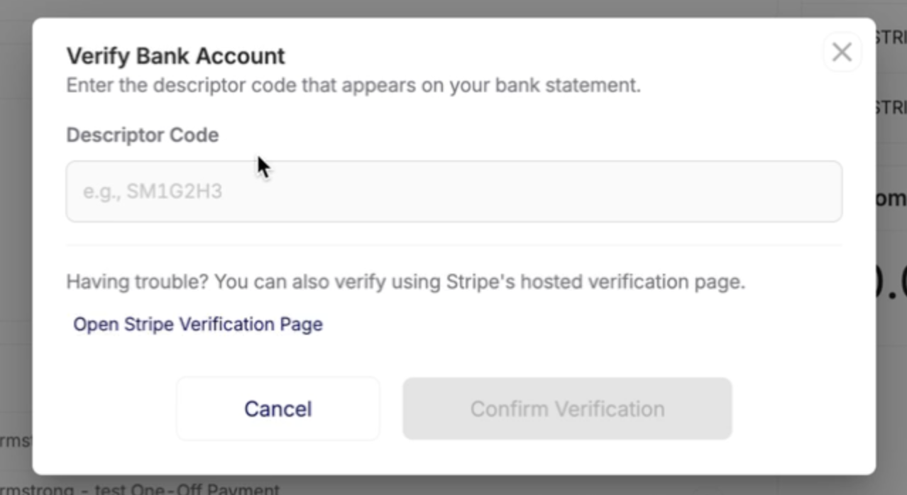 To verify, Stripe will put a small deposit in your bank account. About $0.01 or so.